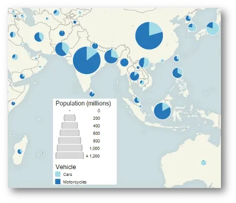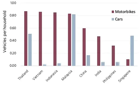 Motorbikes outnumber cars in most South East Asian countries. (Source — collated from multiple sources by author)